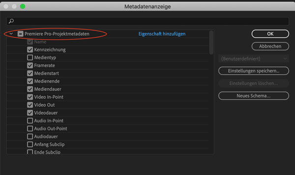 Im sich nun öffnenden Fenster öffnen wir den Bereich ‚Premiere Pro-Projektmetadaten‘.