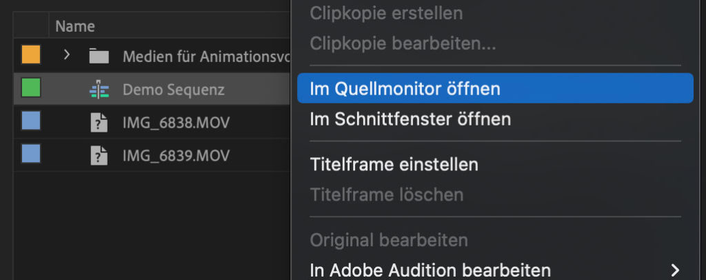 Dazu müssen wir die Original-Sequenz aber in den Quellmonitor bekommen. Das geht in Adobe Premiere Pro CC ganz einfach mit einem Rechtsklick auf die Sequenz auf im Projekt Panel. Es öffnet sich ein Menü, in dem wir etwas runterscrollen und den Menüpunkt ‚Im Quellmonitor öffnen‘ auswählen.